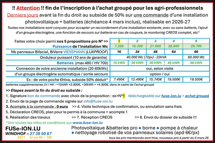 et basé sur le subside de 50% octroyés par l’état luxembourgeois dans le cadre d’un achat de panneaux solaires + batteries (KlimaBonus 2025)